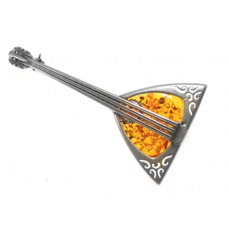 Bałałajka - Piękna srebrna broszka z bursztynem