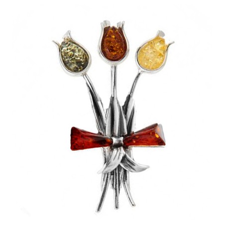 Przepiękna srebrna broszka Tulipany z kolorowym bursztynem